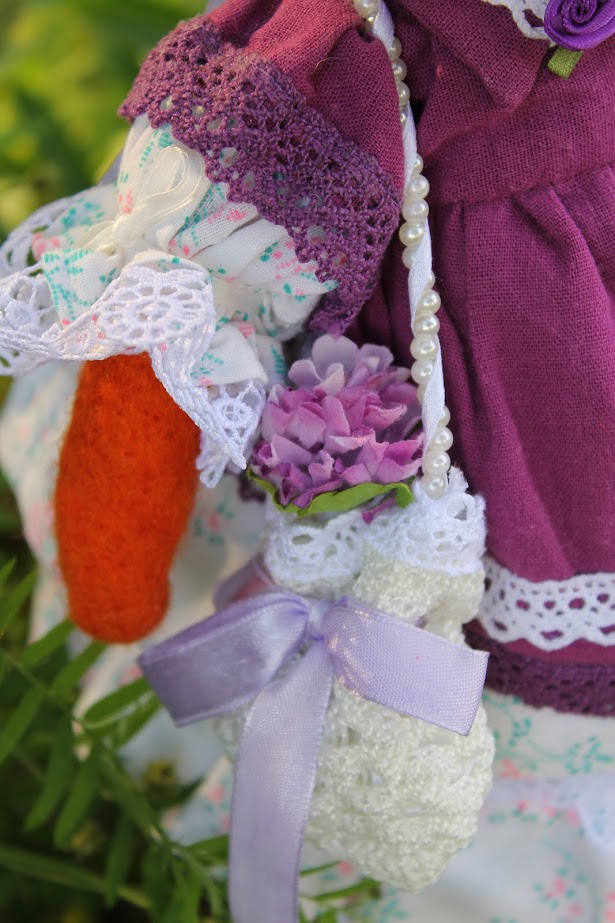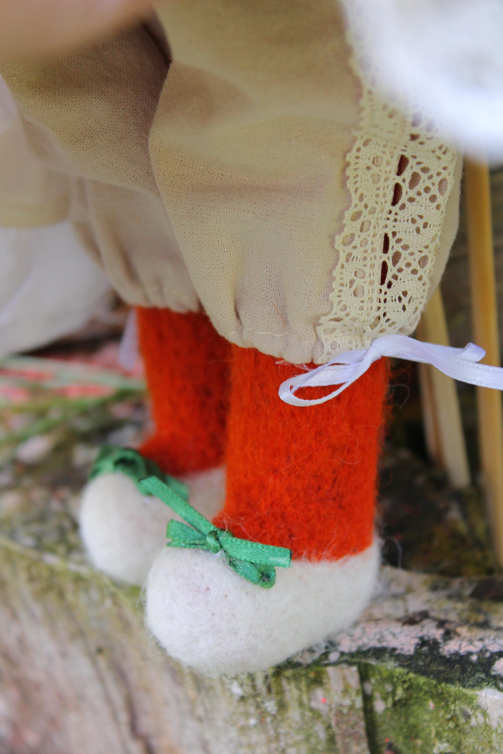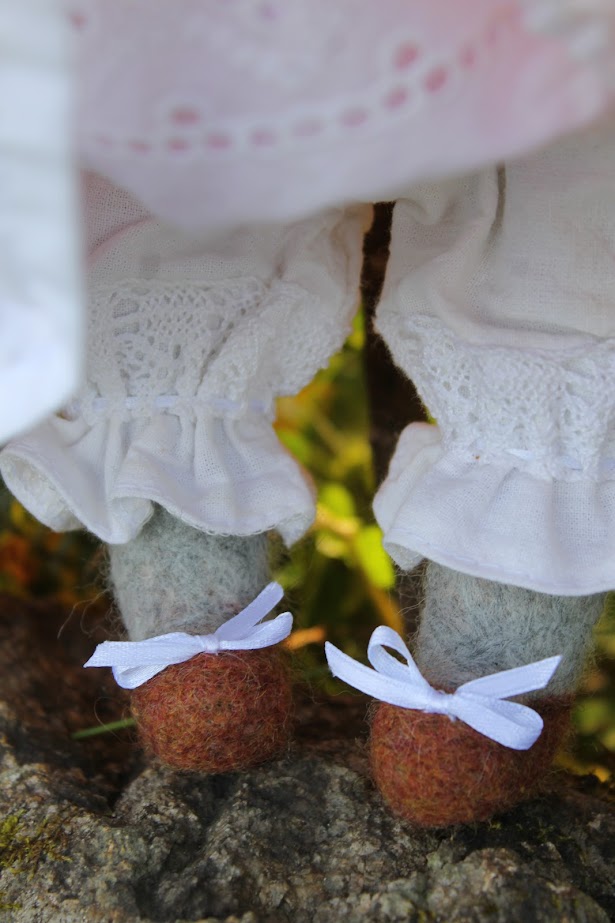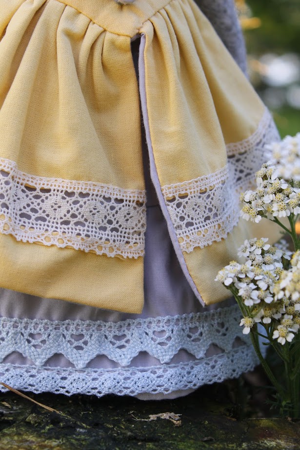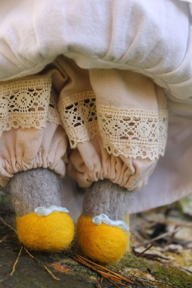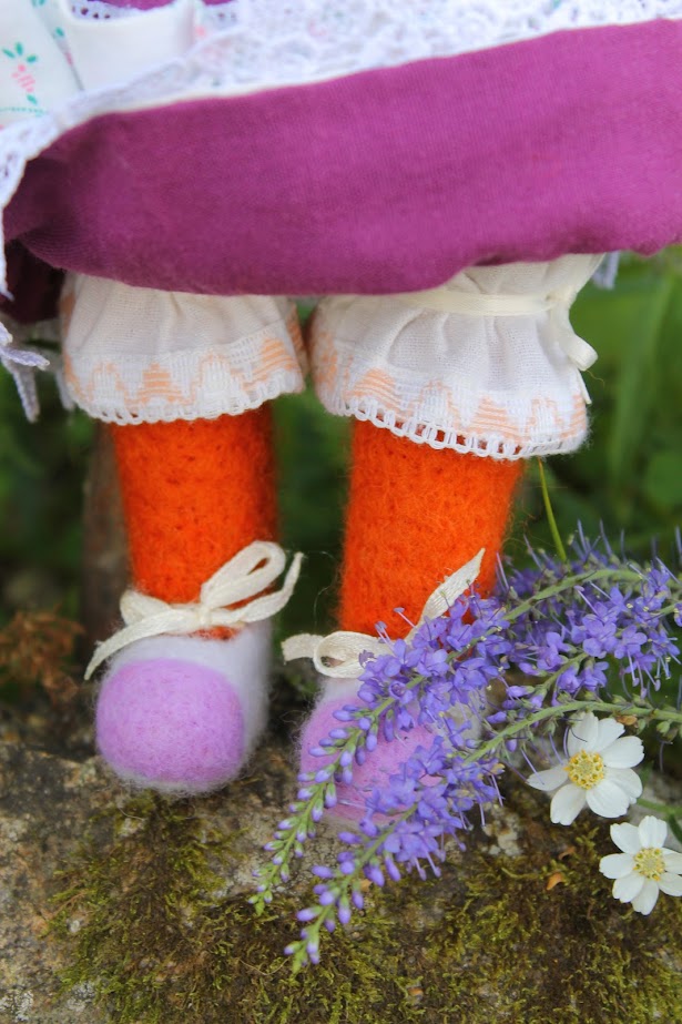 I used wool yarn, then felting wool and cotton as outfits. All dolls consist of 75% wool. She measure 31 cm's