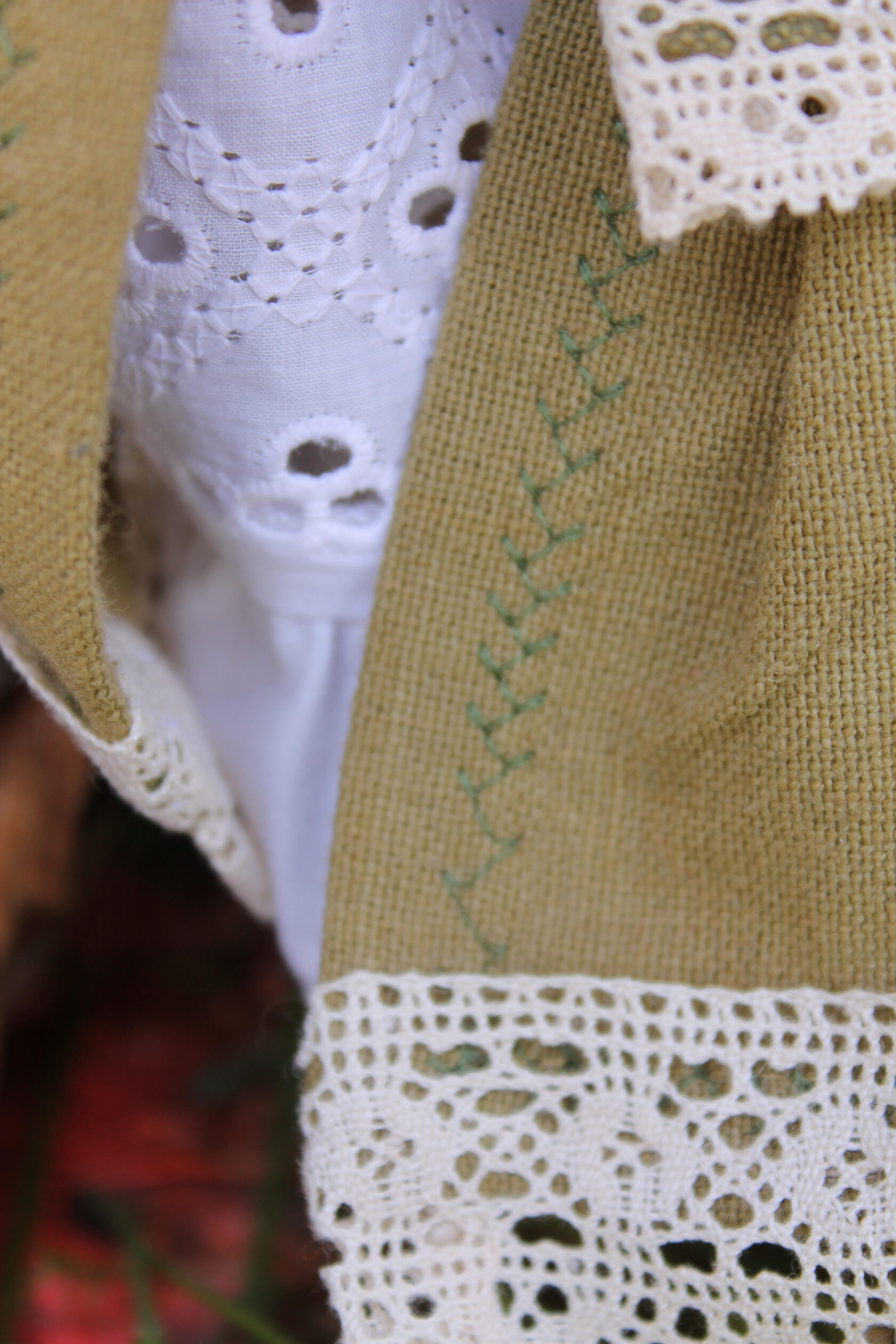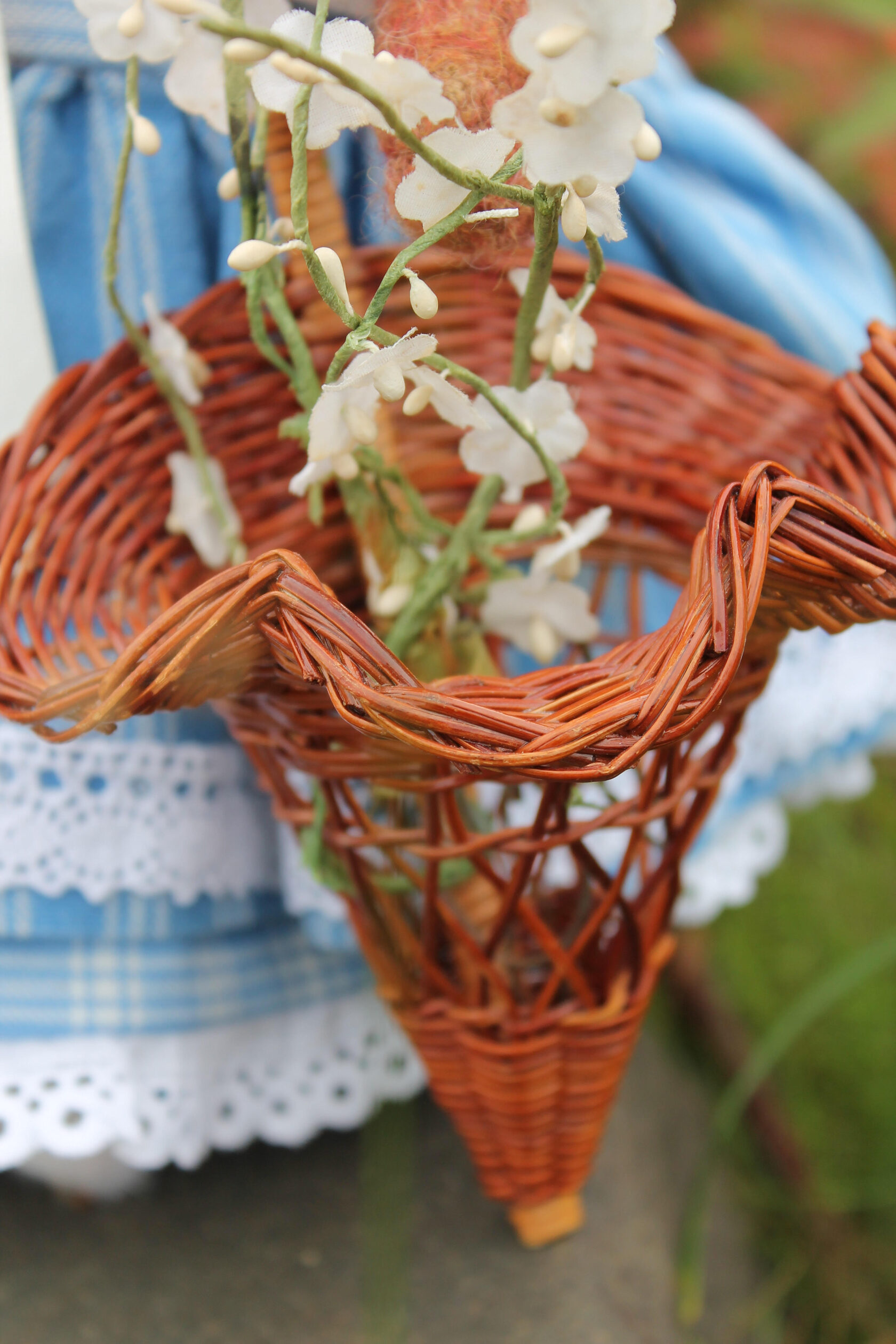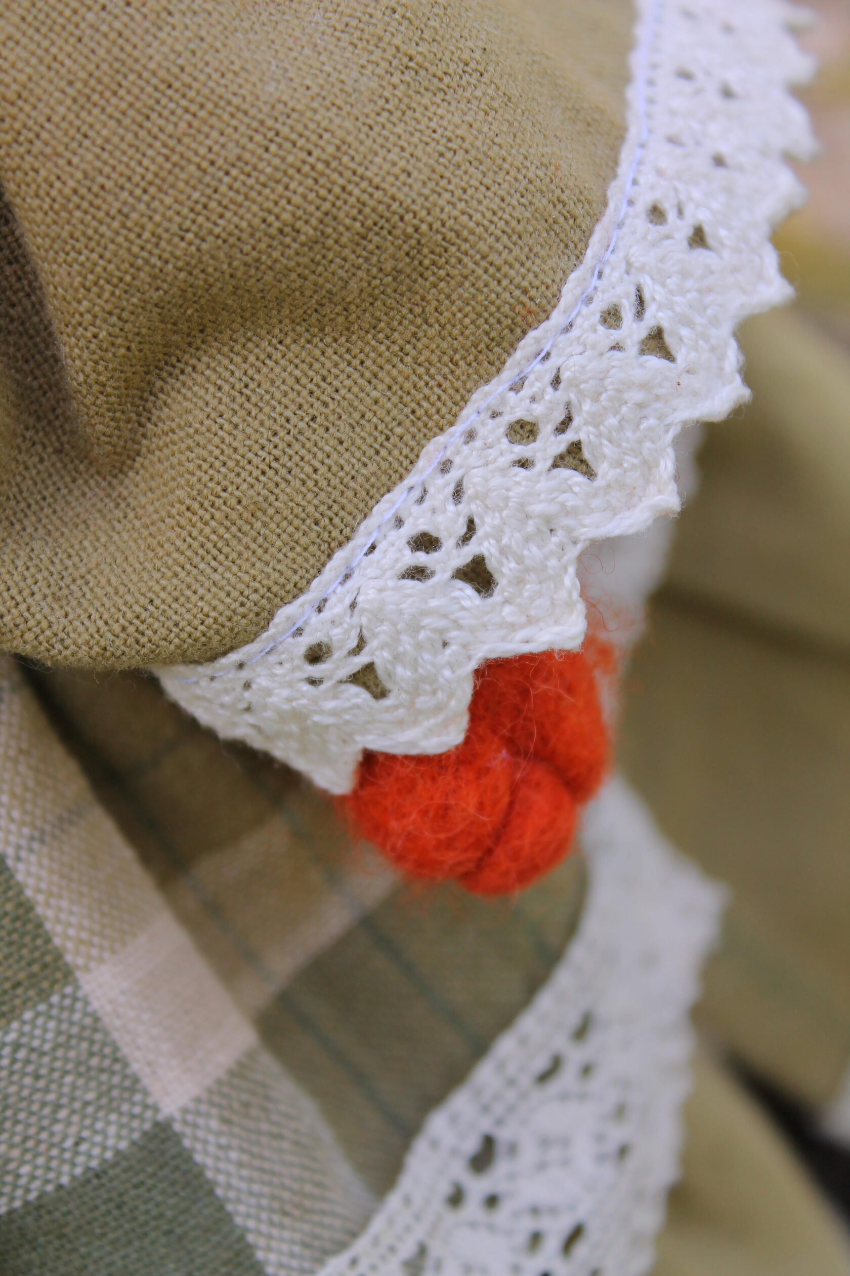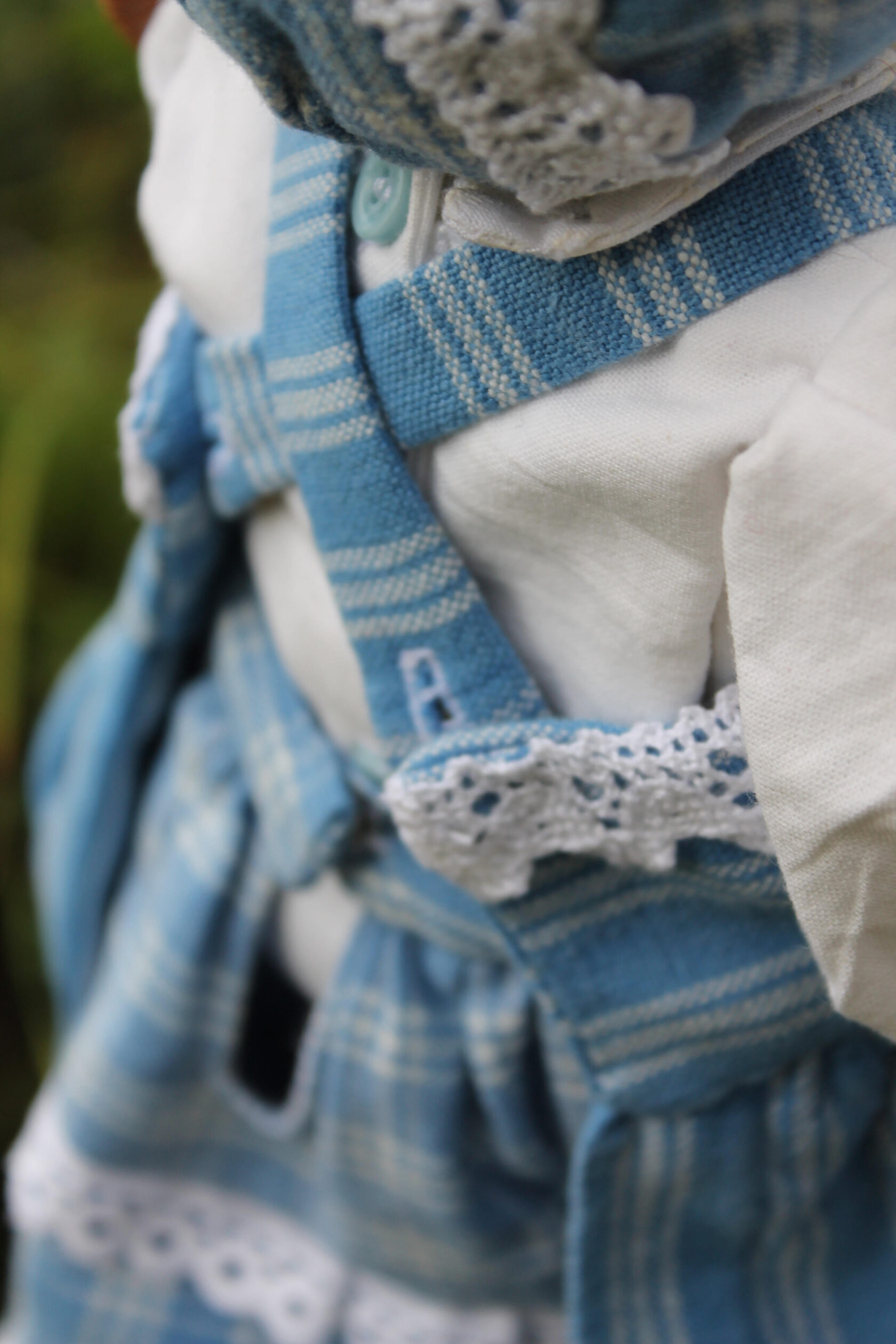I used wool yarn, then felting wool and cotton as outfits. All dolls consist of 75% wool. She measure 31 cm's